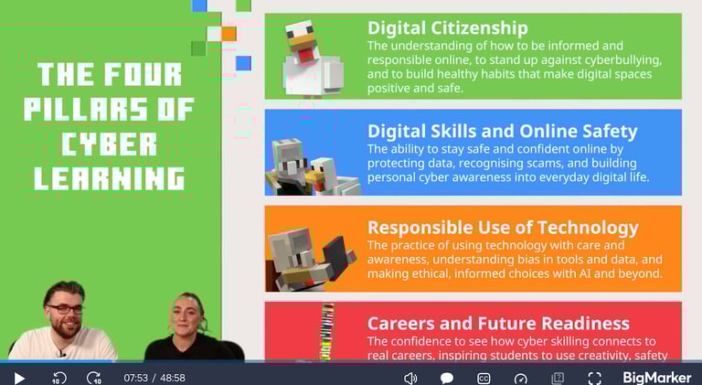 My work here has also included producing live-action segments, writing two hour-long, professional development webinars in AI and Cyber Safety, and designing educator materials.